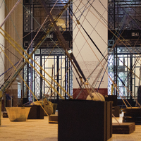 - Esta instalação fez parte da exposição Carmela Gross: Roda Gigante, no Farol Santander de Porto Alegre, ocorrida entre 26 de março e 26 de maio de 2019. Os curadores foram Paulo Miyada e André Severo. A obra é composta por diversos objetos diferentes, cerca de 300, (como baldes de plástico, baús, botijão de gás, livros, máquina de escrever, pneus, etc.) dispostos no chão do saguão principal do edifício, com cordas que amarram cada um deles e os conectam até pontos superiores do local — teto e sacadas. Essas cordas entrecruzadas em várias direções do ambiente cria, visualmente, uma espécie de trama irregular de muitas cores e espessuras variadas (Texto da autora, 2024). Os objetos escolhidos são, segundo a artista, reconhecidos como fragmentos brutos, utensílios banais para os trabalhos desvalorizados da sociedade, especialmente nas grandes cidades. Nas palavras de Carmela, "em suma, uma monstruosa coleção de mercadorias" (2024).